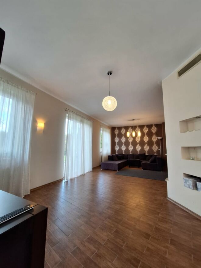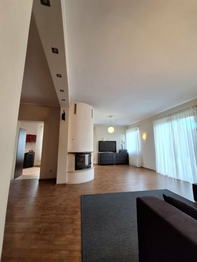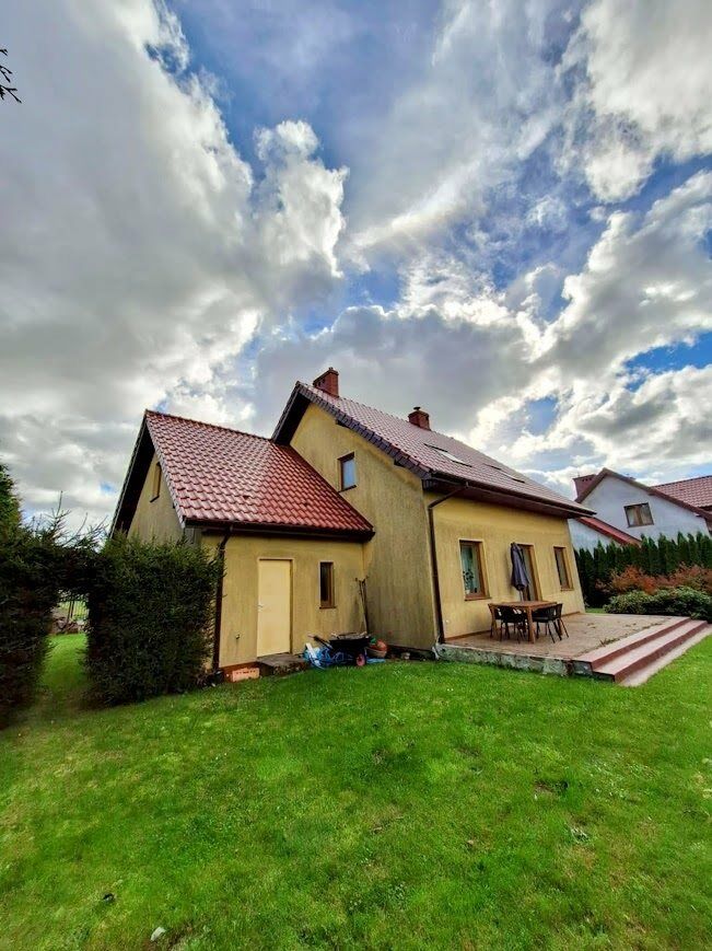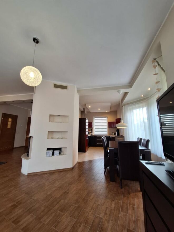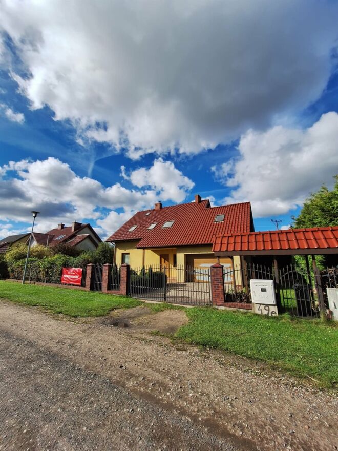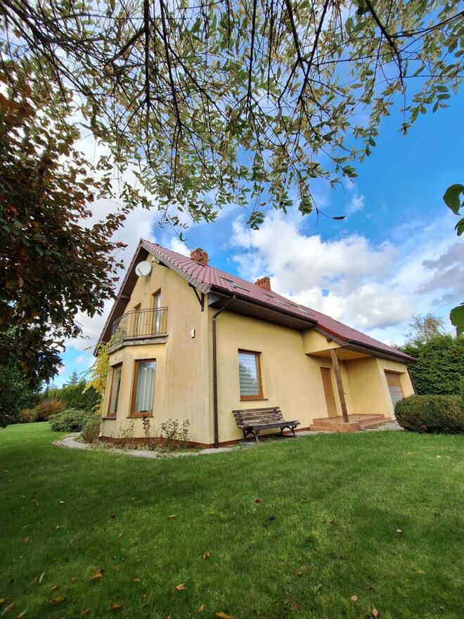 Dom wolnostojący ( około 145m2 ) zbudowany w 2006 roku oddany w 2007. Projekt domu: "gl-124-fistaszek" w projekcie zmiany - brak ściany w salonie oraz powiększenie garażu do 4m, garderoba w sypialni. Ściany zewnętrzne porotherm 24 +styropian. Prostokątna działka ( około 1000m2 ) z dużym potencjałem ok 30 m długości za domem. Dom funkcjonujący i bardzo funkcjonalny gotowy do zamieszkania, podzielony na strefy: dzienną (salon, wydzielona jadalnia i kuchnia oraz mała łazienka) oraz cześć dla domowników na poddaszu użytkowym (dwa pokoje, sypialnia z pokojem i garderobą oraz duża łazienka). Przestronny taras od strony zachodniej na całej szerokości domu (ok 32m2).